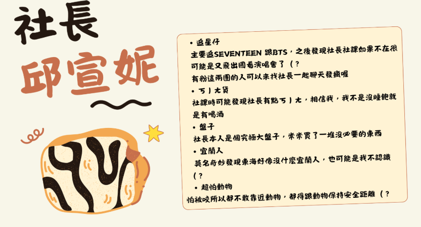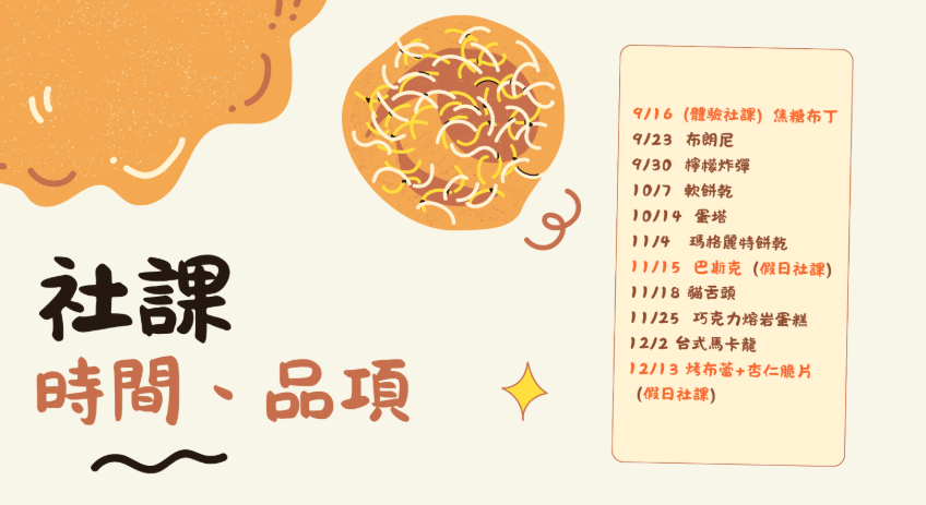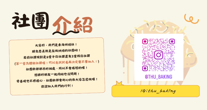 我們是東海烘焙社!目前社課規劃是1堂體驗8堂平日還有2堂假日。歡迎加入我們的行列!